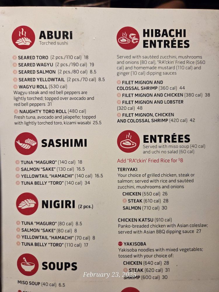 RA Sushi’s menu boasts an impressive variety of options, including fresh nigiri like Salmon Sake and Tuna Maguro, and enticing specialty rolls such as the Crazy Monkey Roll and Viva Las Vegas Roll. For those craving heartier fare, their hibachi entrees like Filet Mignon and Lobster stand out, expertly prepared and served with rich dipping sauces.